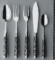 La collection insolent noir argent massif : Dernière création en argent massif de la maison Ercuis, l’insolent s’inspire de la renaissance italienne, siècle d’or du serti. Son manche aux couleurs vives est habillé d’une grille d’argent aux arabesques légères et élégantes. Proche de la joaillerie, la fabrication de ce modèle de prestige nécessite un soin particulier, une grande minutie et un savoir-faire ancestral. L’insolent se marie avec distinction aux décors de prestige de la société raynaud, maître porcelainier à limoges, et séduit une clientèle raffinée qui sait apprécier le délicat travail de l’orfèvre. De la mise en scène sophistiquée d’une table richement décorée à l’élégance d’un intérieur sobre, ce couvert original tout en délicatesse, permettra à chacun de dresser une table unique. L’insolent n’a pas fini de se faire remarquer. . .