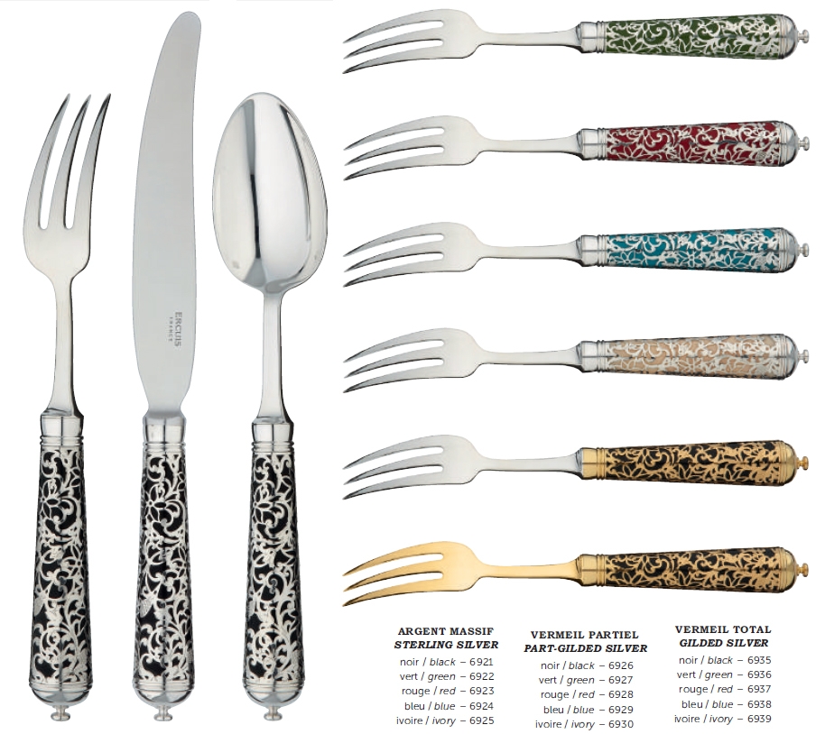 La collection insolent noir argent massif : Dernière création en argent massif de la maison Ercuis, l’insolent s’inspire de la renaissance italienne, siècle d’or du serti. Son manche aux couleurs vives est habillé d’une grille d’argent aux arabesques légères et élégantes. Proche de la joaillerie, la fabrication de ce modèle de prestige nécessite un soin particulier, une grande minutie et un savoir-faire ancestral. L’insolent se marie avec distinction aux décors de prestige de la société raynaud, maître porcelainier à limoges, et séduit une clientèle raffinée qui sait apprécier le délicat travail de l’orfèvre. De la mise en scène sophistiquée d’une table richement décorée à l’élégance d’un intérieur sobre, ce couvert original tout en délicatesse, permettra à chacun de dresser une table unique. L’insolent n’a pas fini de se faire remarquer. . .